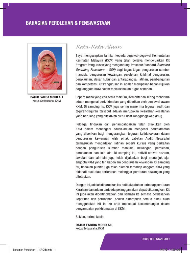 Setiausaha BahagianBahagian Perolehan PenswastaanKementerian Kesihatan MalaysiaAras 4 7 Blok E7 Kompleks EPusat Pentadbiran Kerajaan Persekutuan62590 Wilayah Persekutuan. GARISPANDUAN PEROLEHAN KERAJAAN ISI KANDUNGAN Muka surat 1 Pendahuluan 2 2 Jenis-Jenis Perolehan 2-5 3 Tatacara Penyediaan Dokumen Pelawaan Tawaran Dan Sebut Harga. Perolehan Kerajaan dan orang awam adalah tertakluk kepada Akta Suruhanjaya Pencegahan Rasuah Malaysia 2009 Akta 694.